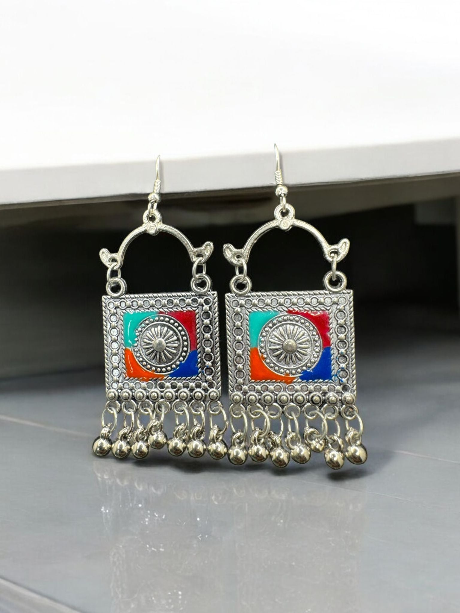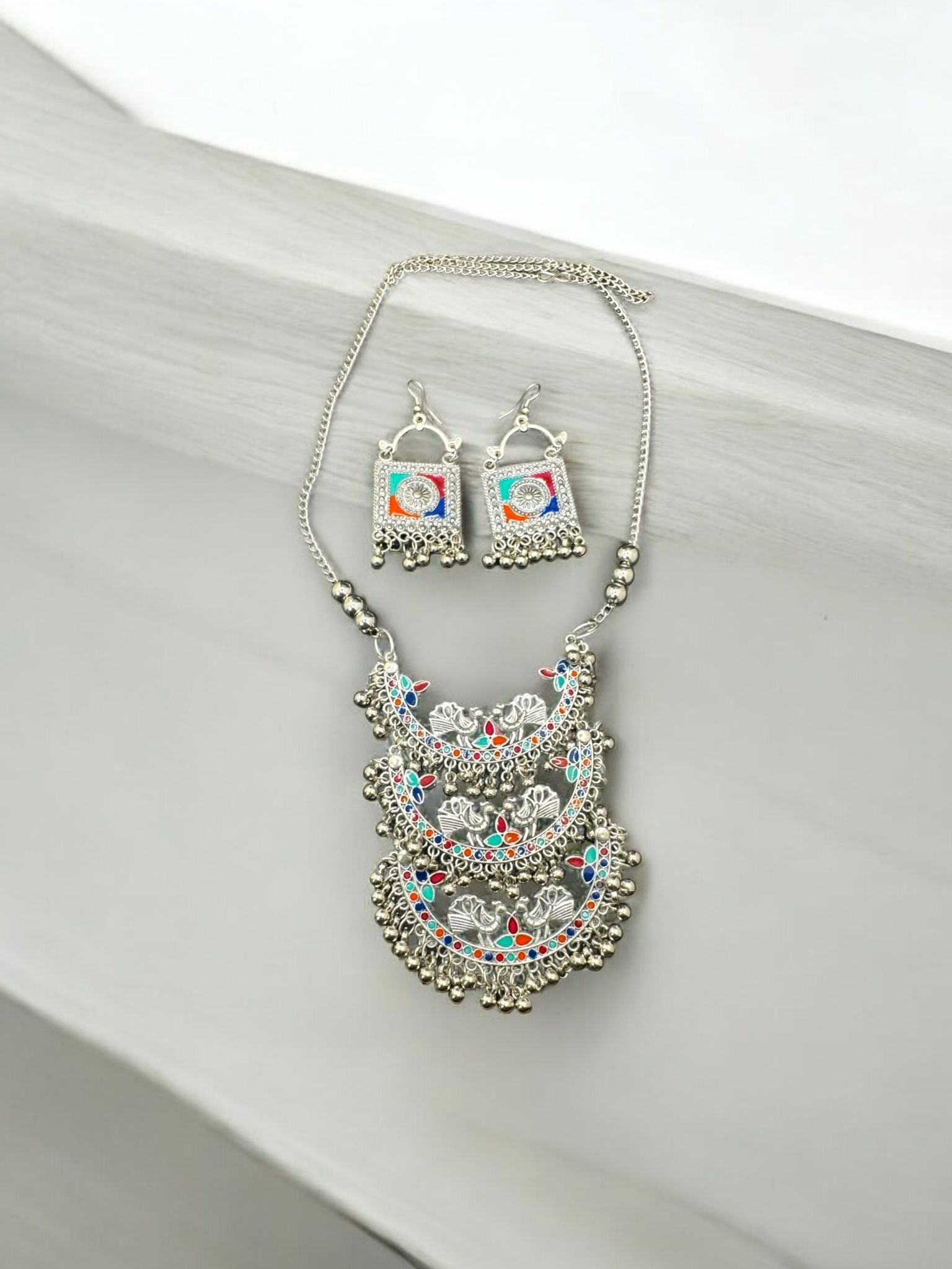 Add a touch of eclectic charm to your ensemble with the Bohemian Symphony Necklace Set. This set features a striking necklace with layered crescent-shaped pendants adorned with intricate enamel work in vibrant hues of red, blue, and green. The matching square-shaped earrings echo the colorful motifs, making this set a bold and beautiful statement piece for any occasion. Perfect for those who love to express their individuality, this set pairs well with both traditional and contemporary outfits.