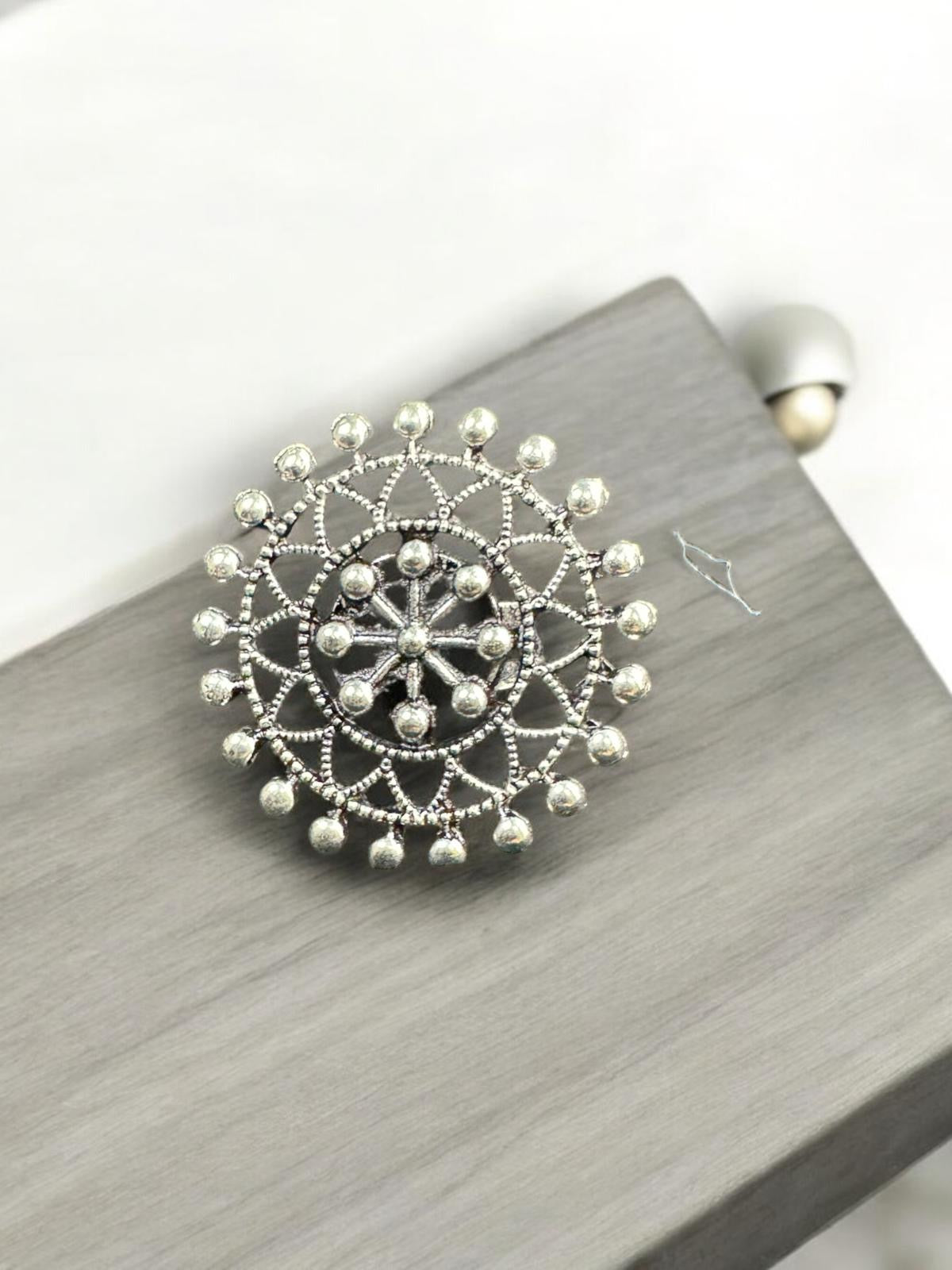 Channel the cosmic energy with the Celestial Orbit Statement Ring. This intricately designed piece features a mesmerizing circular pattern reminiscent of planetary orbits, adorned with polished silver spheres that add a touch of celestial elegance. Perfect for those who love to make a bold statement with their accessories, this ring embodies both the mystery and beauty of the universe, making it a timeless addition to any jewelry collection.