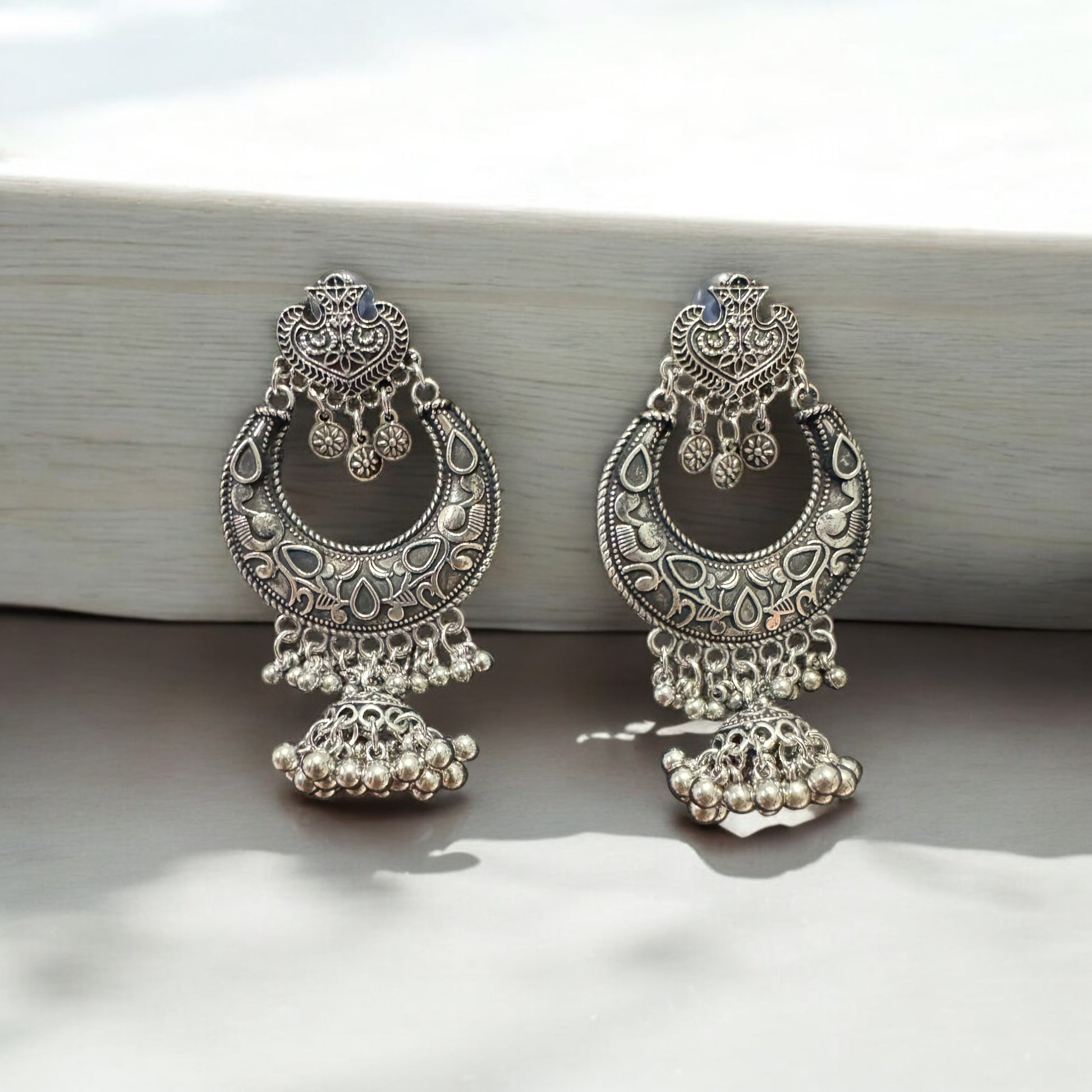 These Enchanted Crescent Silver Earrings feature a beautifully detailed crescent design adorned with intricate patterns and delicate dangling elements, perfect for adding a touch of mystic elegance to any ensemble.