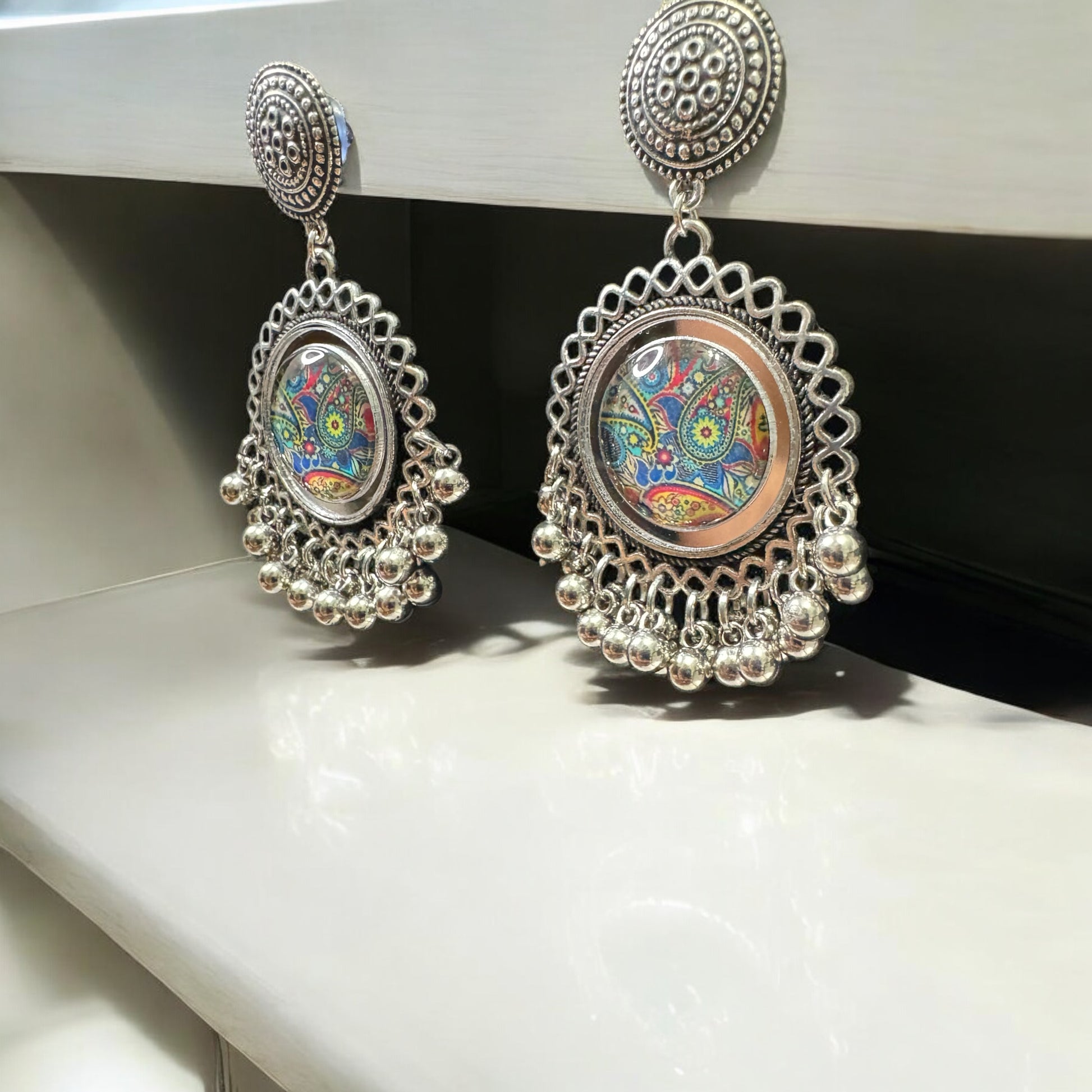 These Kaleidoscope Silver Charm Earrings feature vibrant, intricate designs encased in a silver frame, adorned with delicate dangling elements. Perfect for adding a splash of color and artistic flair to any outfit.