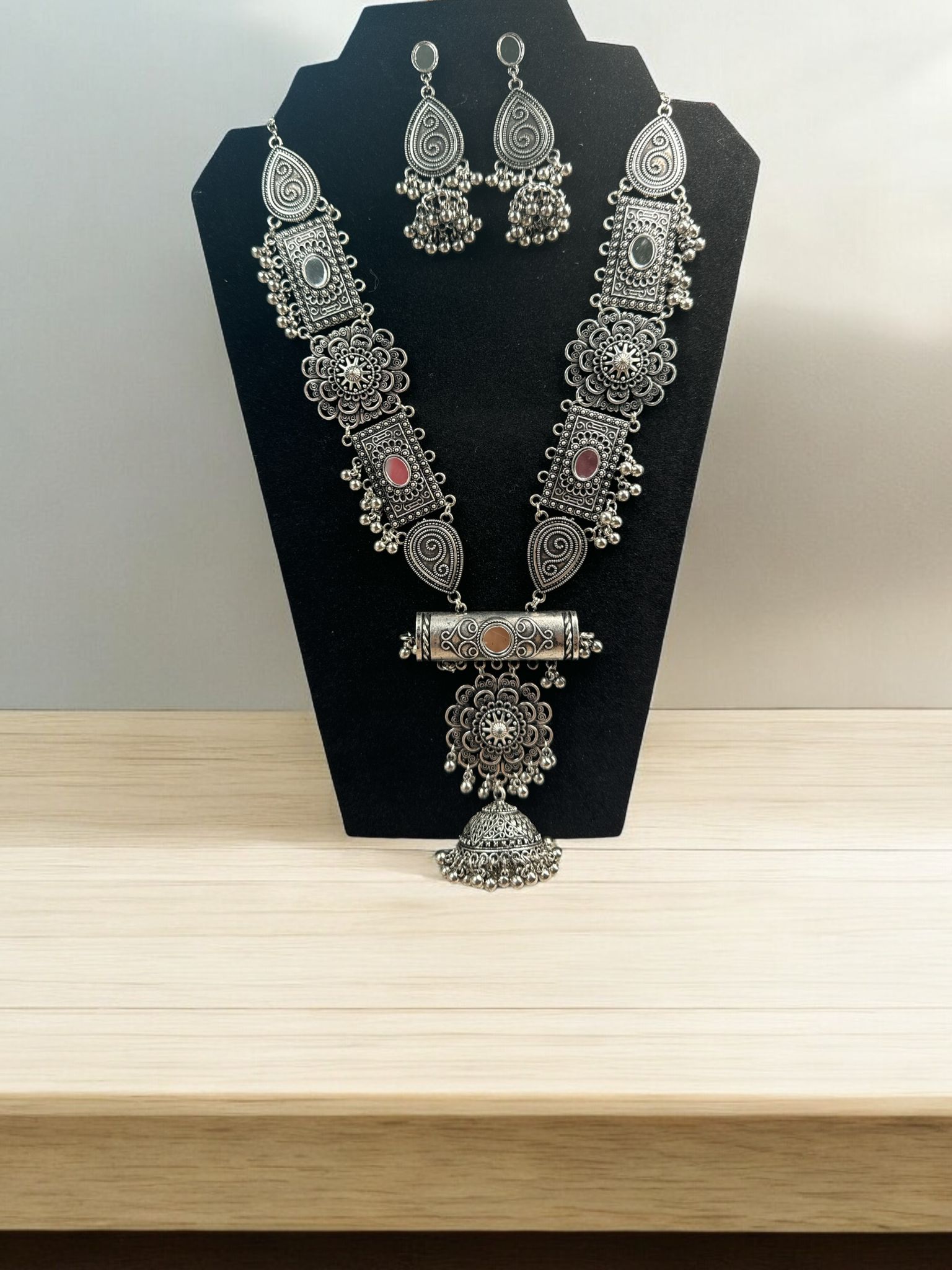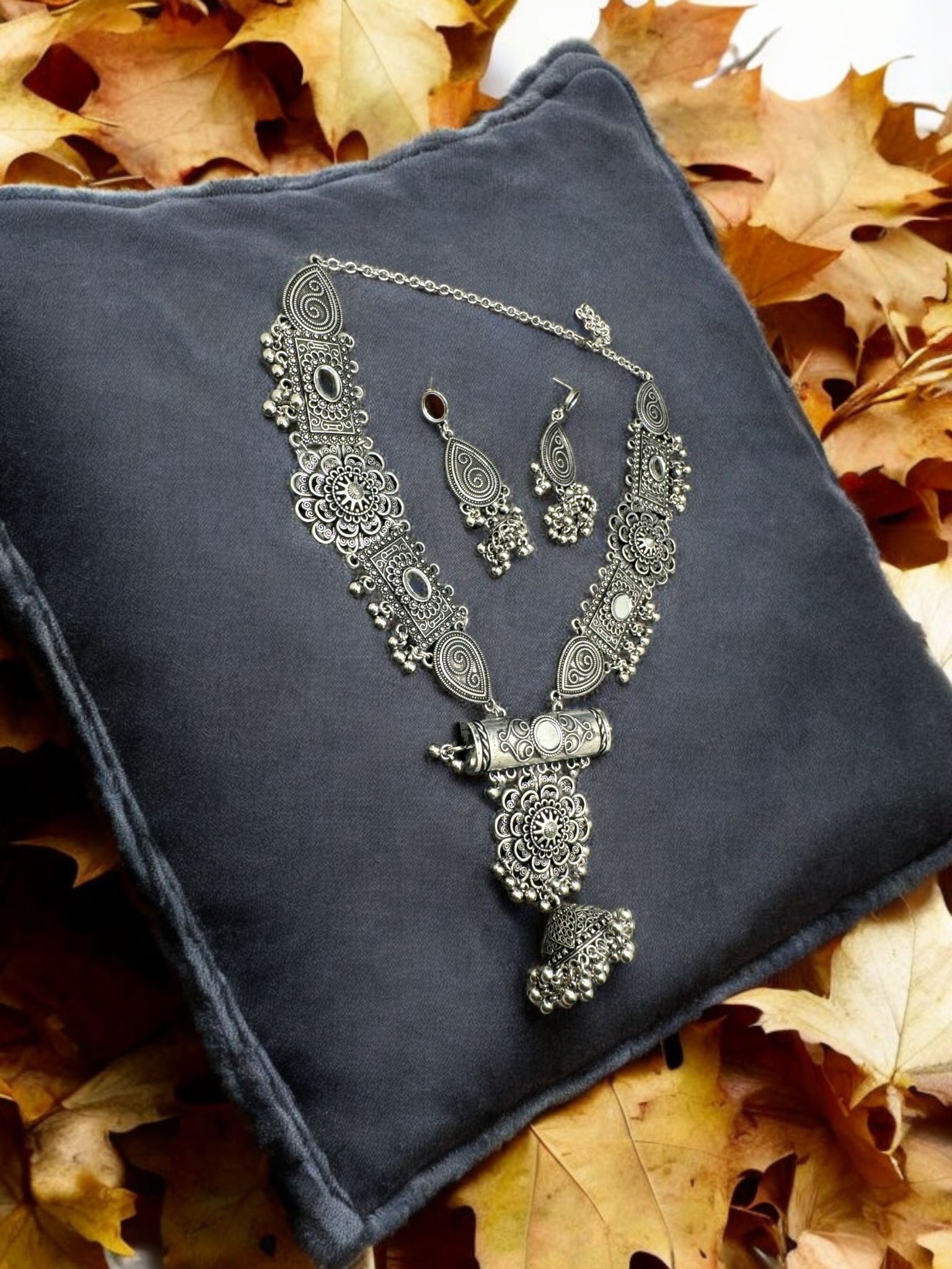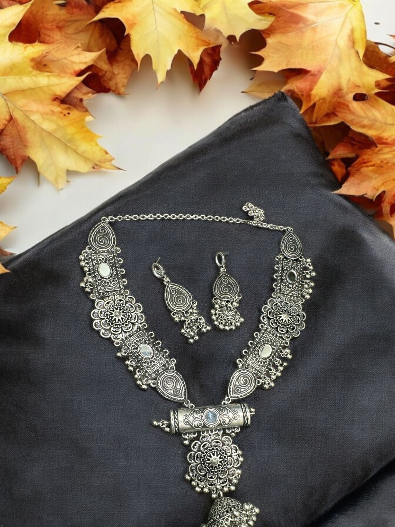 Embrace the mystique of tribal-inspired design with the Ornate Elegance Tribal Necklace Set. This stunning set features a statement necklace adorned with intricate patterns and bold, textured elements, evoking the richness of ancient craftsmanship. The necklace is complemented by matching earrings that mirror the ornate detailing, making this set a perfect choice for adding a touch of drama and elegance to any outfit. Whether for a special occasion or a unique fashion statement, this set is sure to turn heads.