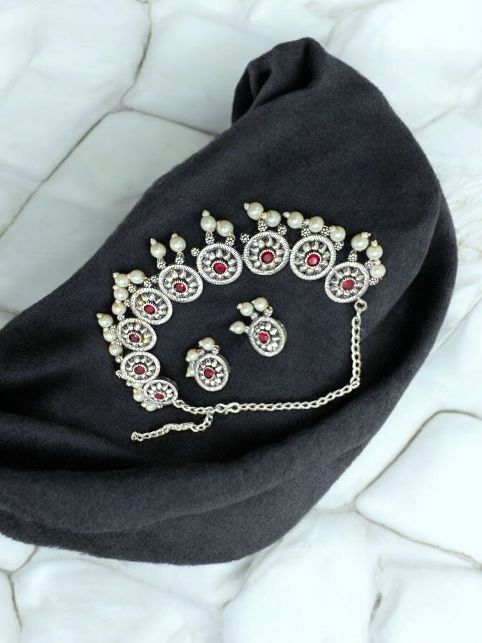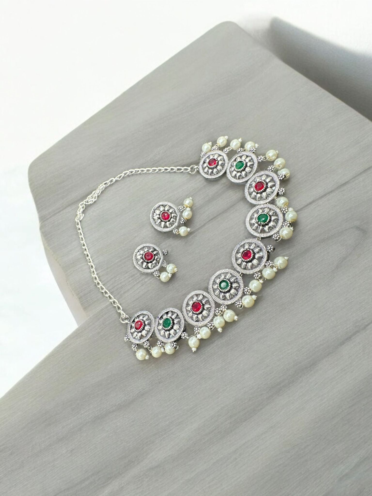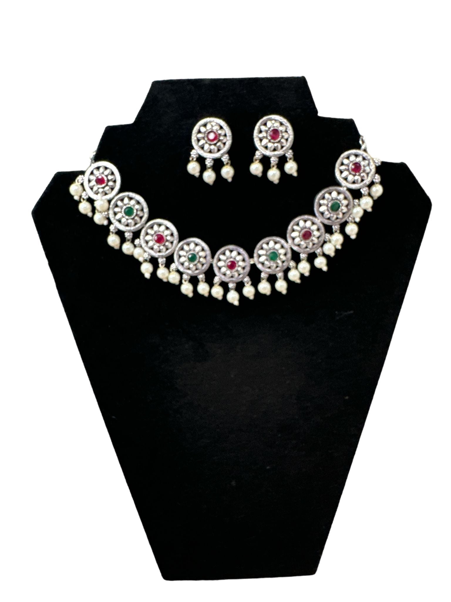 Infuse your look with a touch of vintage charm with the Radiant Circles Silver Choker Set. This exquisite set features a delicate choker adorned with circular motifs, each embellished with vibrant red and green stones at the center, surrounded by intricate detailing. Faux pearl drops add a graceful finish, making this set a perfect blend of tradition and contemporary style. Paired with matching earrings, this choker set is ideal for festive occasions and special celebrations, exuding elegance and sophistication.