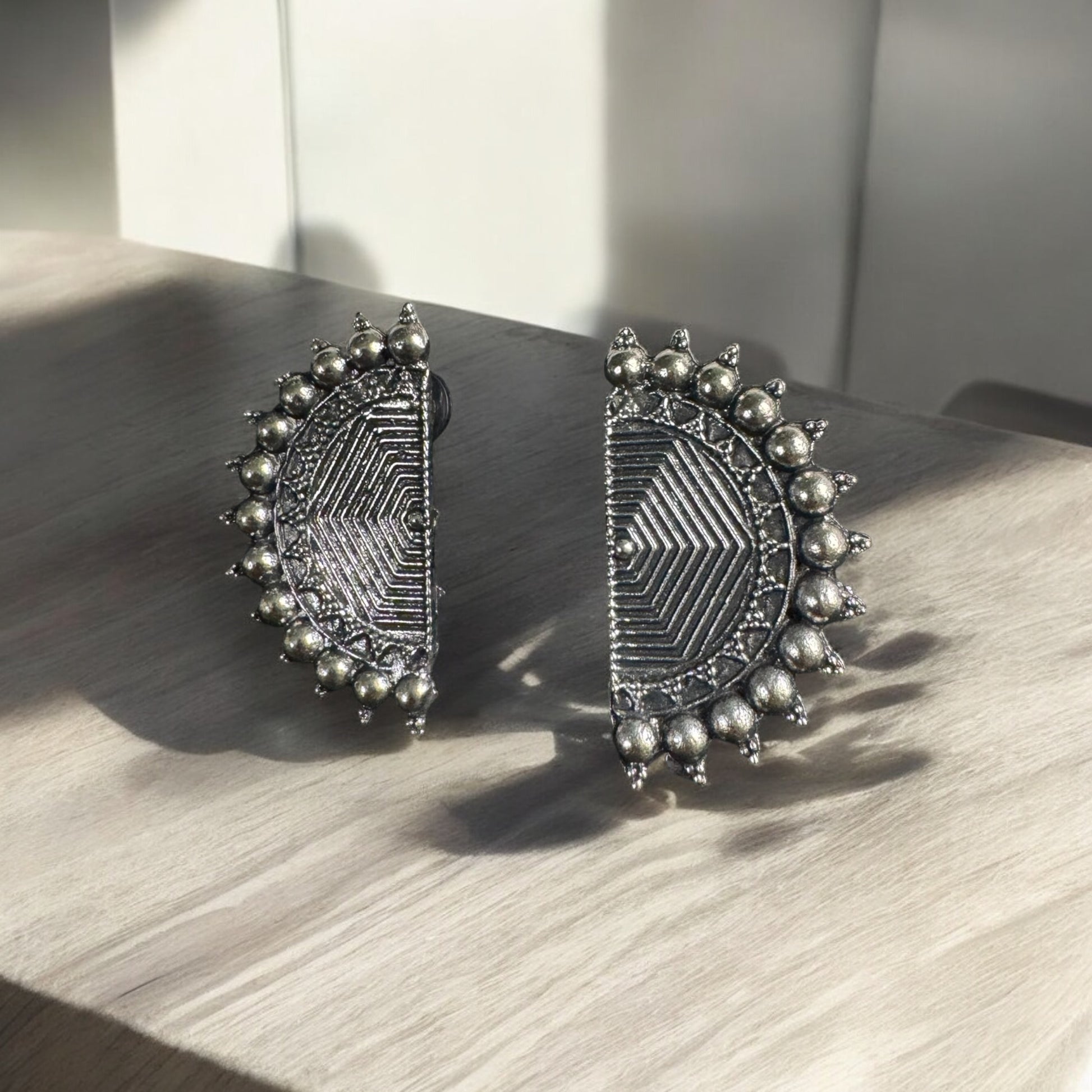 These Radiant Geometric Half-Moon Earrings feature a bold and intricate design, combining sharp lines with delicate beading, perfect for adding a touch of modern elegance to any outfit.