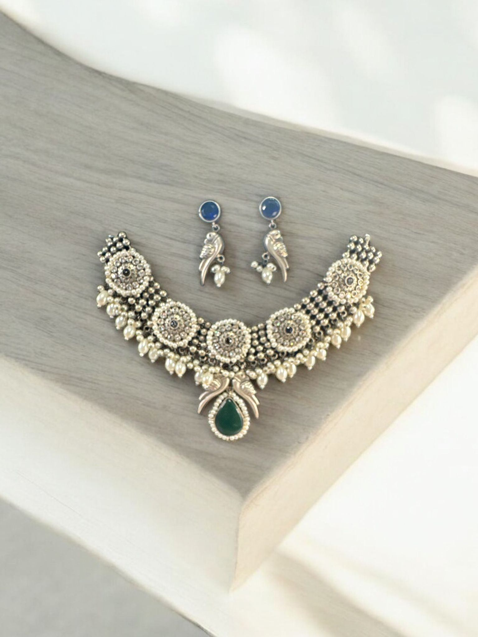 Embrace timeless elegance with the Regal Blossom Antique Necklace Set, an exquisite piece that embodies vintage charm and sophistication. This set features a beautifully crafted necklace adorned with intricate floral motifs and cascading faux pearls, complemented by delicate matching earrings. The antique silver finish enhances the classic appeal, making it a perfect choice for both traditional and contemporary outfits. Whether for a special occasion or adding a touch of grace to everyday wear, this set is a must-have in your jewelry collection.